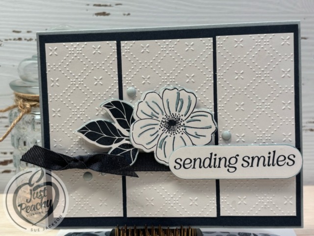 - I adhered the dry-embossed cardstock to the Misty Moonlight base
