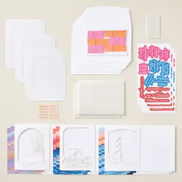 If beautiful sunsets are your thing, the Painted Skies Kit is calling your name. Create vibrant, hand-painted–style skies with scenes featuring lighthouses, palm trees, and rolling ocean waves as your artistic focal points. Friendly greetings, gratitude themes, and celebratory sentiments add just the right finishing touch.