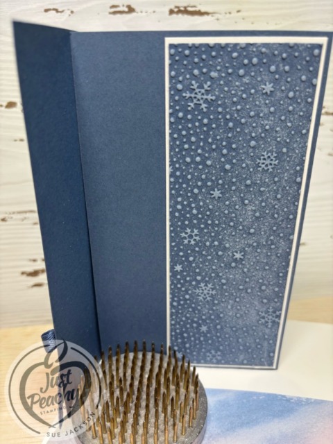 - I stamped a larger snowflake on the inside white cardstock next to the sentiment using VersaMark ink, clear embossing powder, and heat set it with my heat tool
