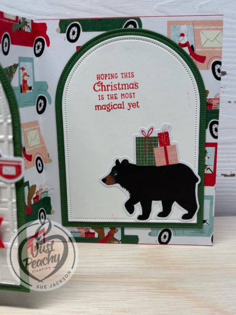 Stamp the inside sentiment using Poppy Parade ink and adhere the present carrying bear to the white die cut arch.