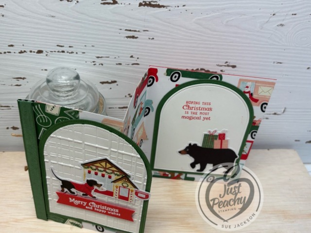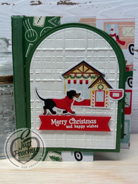 Adhere the Plaid embossed arch on white cardstock to one of the Garden Green arches. Adhere the prancing delivery dog and post office to the white cardstock arch, then adhere the front sentiment.