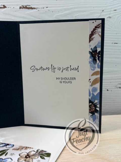 - After adhering the strip of DSP to the inside of the card, I used two sentiments from the Prairie Grass stamp set using Secret Sea ink and adhered it to the inside of the card