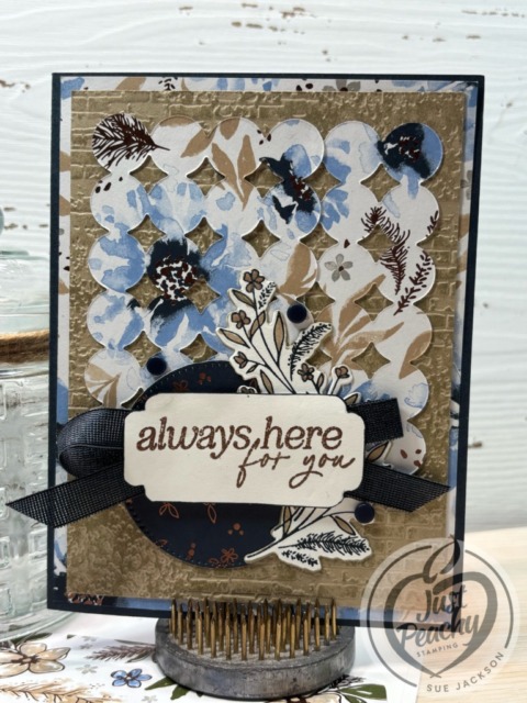 I’ve been unlucky enough to catch the pretty nasty germs going around and have had too much time to “doom scroll”, but with a purpose. While scrolling through Instagram, I came across a reel posted by Heidi Collins from On Y Go Stamping using a brayer on a dry embossed piece of cardstock. You can see that video here. I had to try it asap, and used it for the front of this card. After dry embossing a piece of Crumb Cake cardstock using the distressed brick embossing folder, I used Crumb Cake ink and a applied it with a brayer.