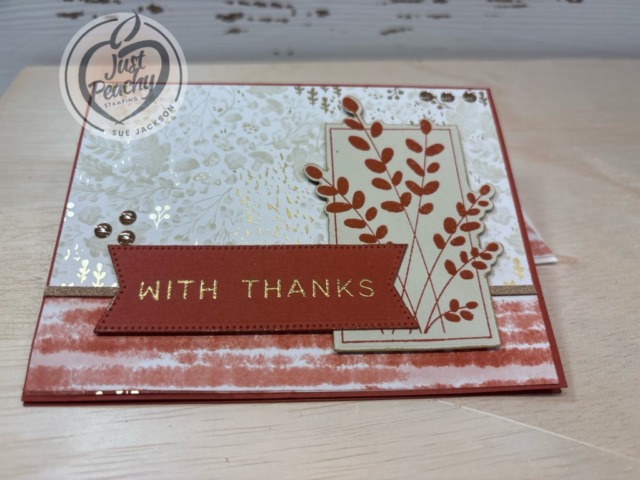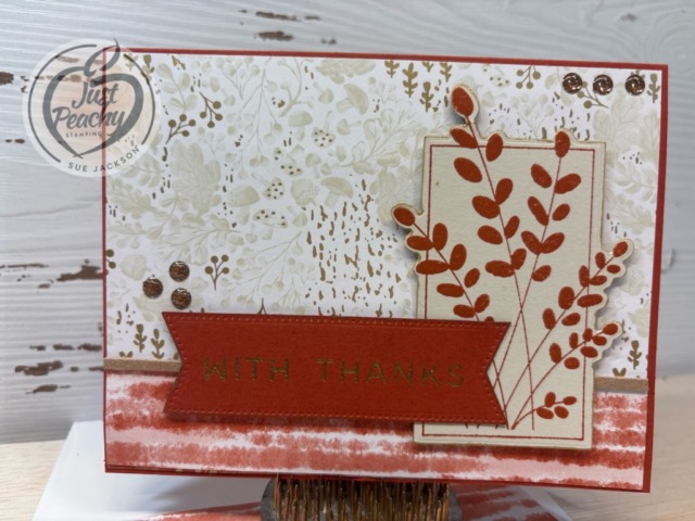 - I used scraps of Cajun Craze and Basic Beige cardstock for the foliage rectangle & sentiment banner on the front of the card