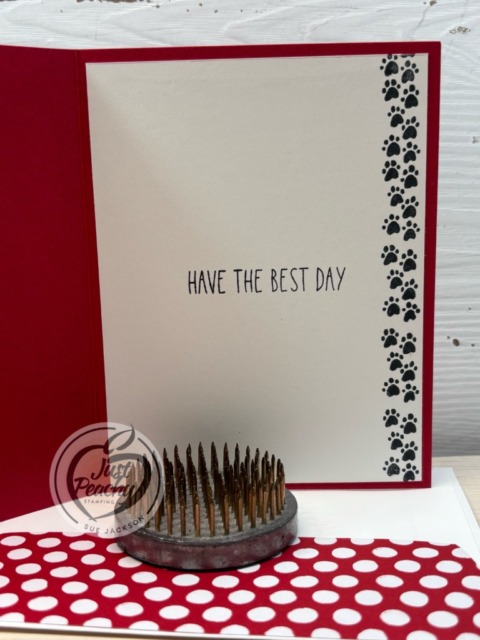 After stamping the sentiment and paw prints on the white cardstock, I adhered it to the inside of the card
