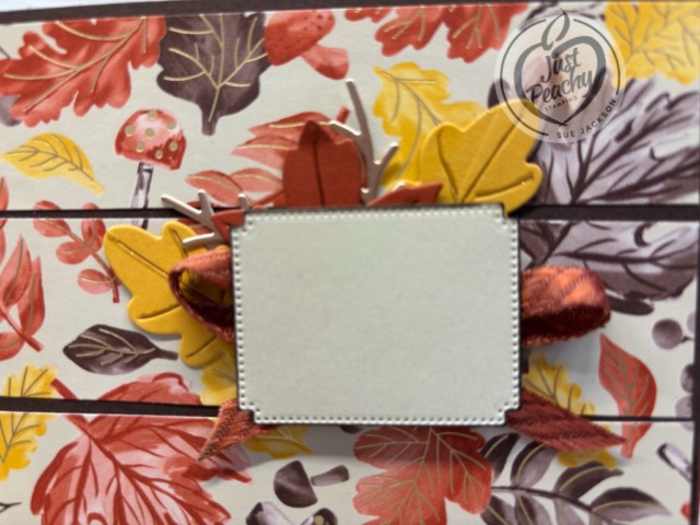 in addition, here’s the inside and a close-up of the leaves and ribbon behind the blank sentiment block:
