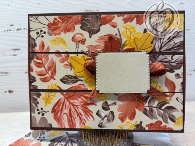 Using the leave spray from the Textured Notes stamp set, add Cajun Craze ink to the stamp and stamp it off twice before stamping on the Basic Beige cardstock for the inside