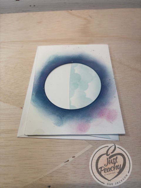 Using a blending brush, Balmy Blue ink, and the circular mask, add color to the bottom left corner of the inside piece of cardstock and on the same place on the front of the envelope