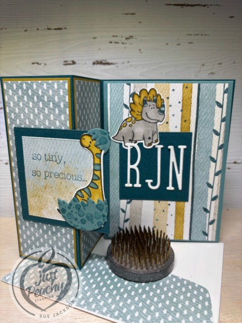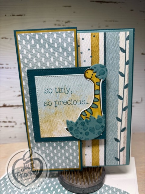 I used the colors on the DSP to color the dinosaurs using the blend combos of Pretty Peacock, Lost Lagoon, Wild Wheat, and Gray Granite – aren’t they all adorable!