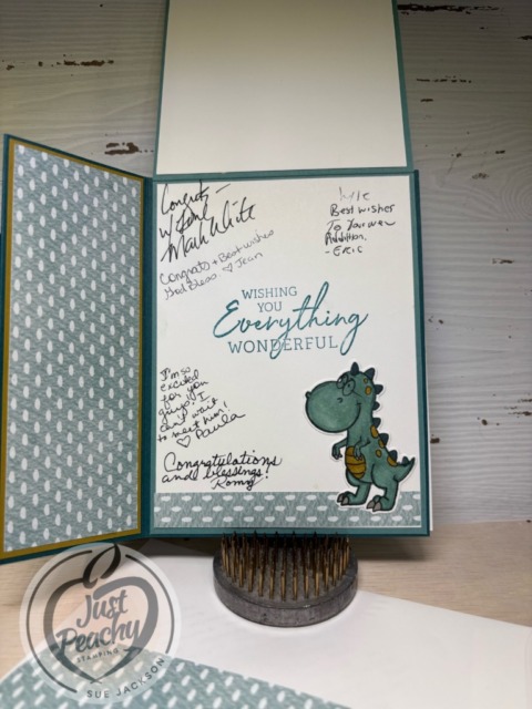 I used Darling Dinos stamp and die set and the Everyday Happiness DSP (designer series paper) for my baby card. I need to say that this card was made specifically for a work colleague and I forgot to take pictures before some of us signed it. I did ask everyone if it was ok to take pictures after they signed it, so they all knew what I’d forgotten to do.