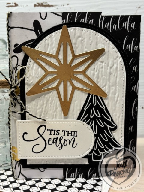 I needed to crop 4 black arches and 4 white arches. I just realized that the arches on the card with the white on black tree are larger than the other card. I think I like the larger arches, but the smaller set shows more of the DSP on the front.
