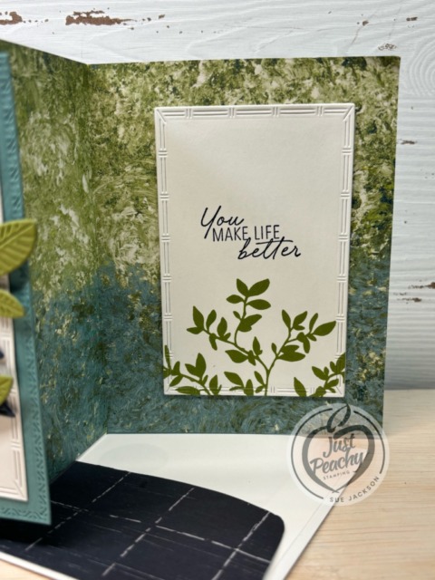 The sentiments are stamped with Secret Sea ink, then I used Old Olive to stamp the foliage on the bottom of the inside panel