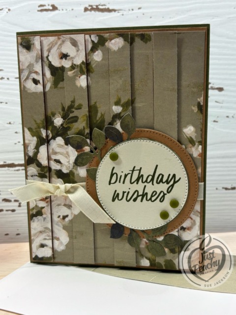 - Using Mossy Meadow ink, I stamped the birthday wishes sentiment on the Basic Beige circle