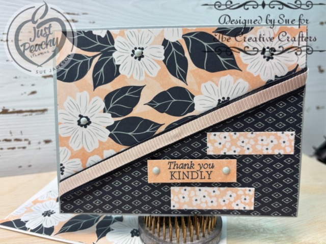 - I stamped the sentiment on the Petal Pink DSP using Secret Sea ink and adhered it with dimensionals